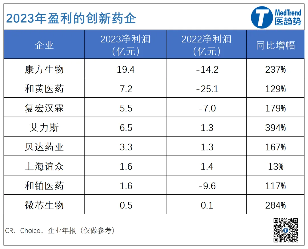 2023年,实现盈利的中国创新药企增加至8家,其中康方生物、和黄医药、复宏汉霖、和铂医药是首次扭亏为盈。