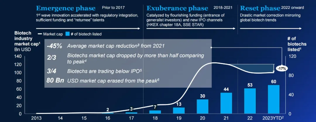 麦肯锡去年发布的一份报告评估了60家总部位于中国的生物技术公司股价表现,发现截至2023年9月,每四家公司中就有三家的交易价格低于其IPO价格,自2021年6月达到峰值以来,已有800亿美元(约5791亿元)市值化为乌有。