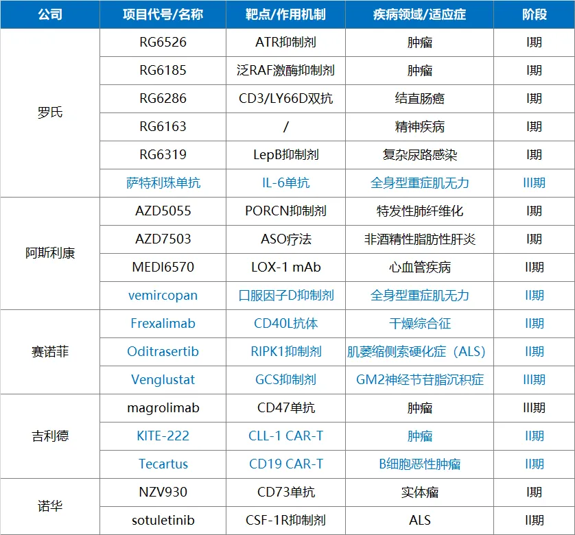 注:数据来自各企业财报,有些项目为完全放弃,表格中为黑色字体书写,有些项目是放弃部分适应症,表格中用蓝色字体书写