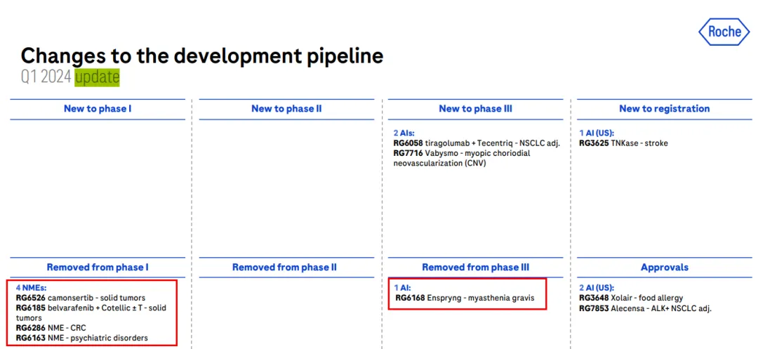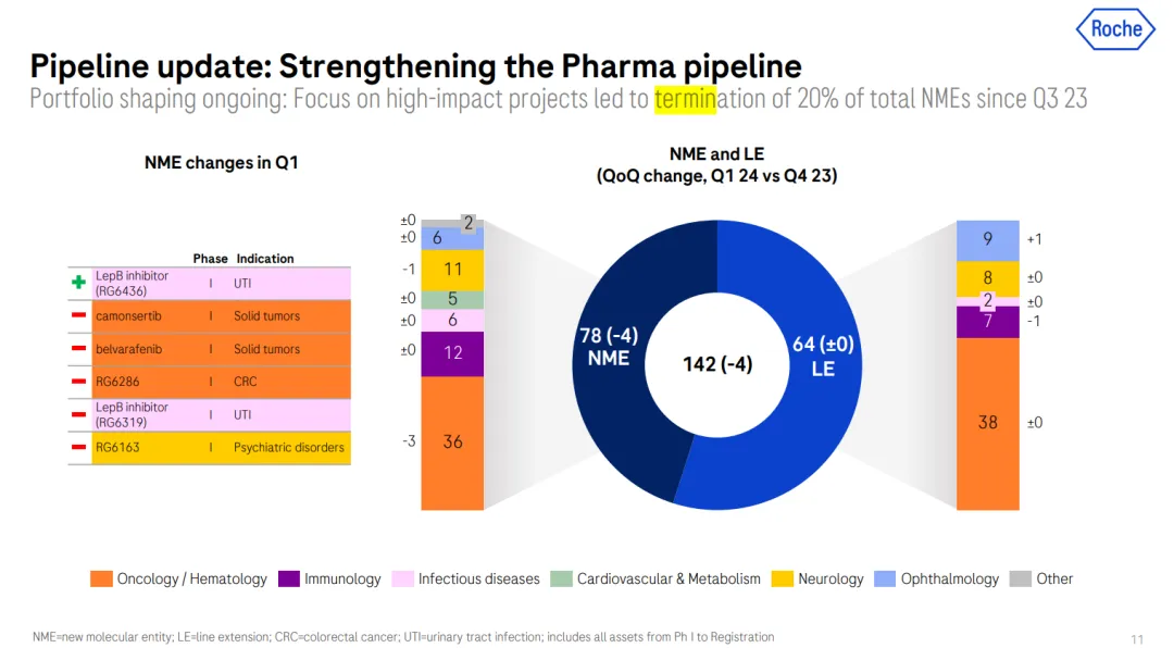 罗氏致力于聚焦高潜力项目,自去年第3季度以来,已经终止了20%新分子实体药物(NME)的开发。本季度,罗氏共从管线中剔除了6个项目(5个NME,1项新适应症)。