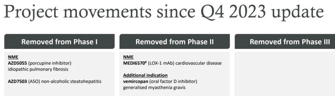 本季度,阿斯利康共剔除了3个NME和1项适应症,分别是AZD5055、AZD7503、MEDI6570和vemircopan的一项适应症。