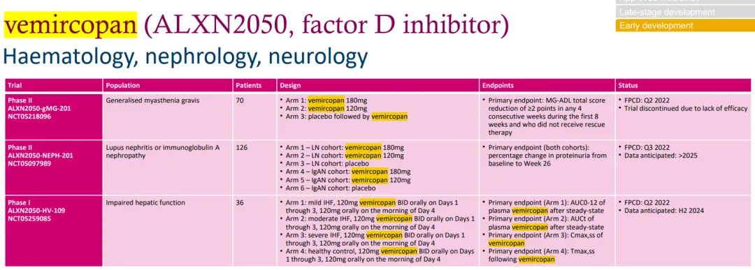 此外,阿斯利康还终止了口服因子D抑制剂vermicopan治疗全身型重症肌无力的开发,原因是缺乏疗效。vermicopan正在开发的适应症还包括:增生型狼疮肾炎和IgA肾病、肝功能受损。