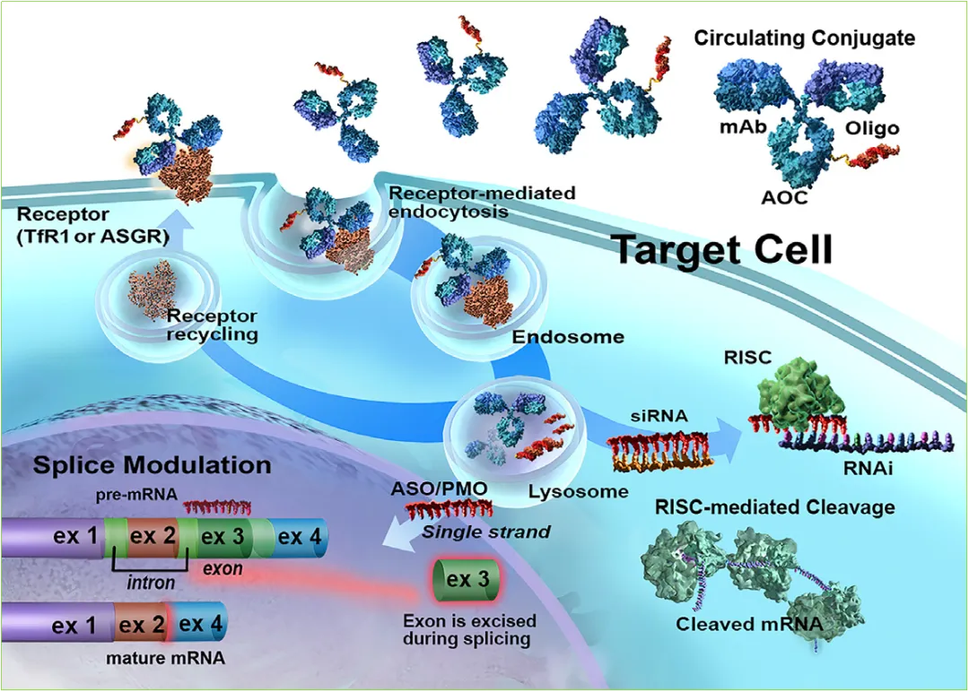 AOC药物的开发,就是希望解决小核酸现有的、先天的血清稳定性差、膜通透性低、缺乏组织选择性等问题,并结合抗体更长的半衰期以及良好的靶向递送特性,最终组合成为AOC所特有的高精度选择性以及抗体的靶向递送性,达成共赢。