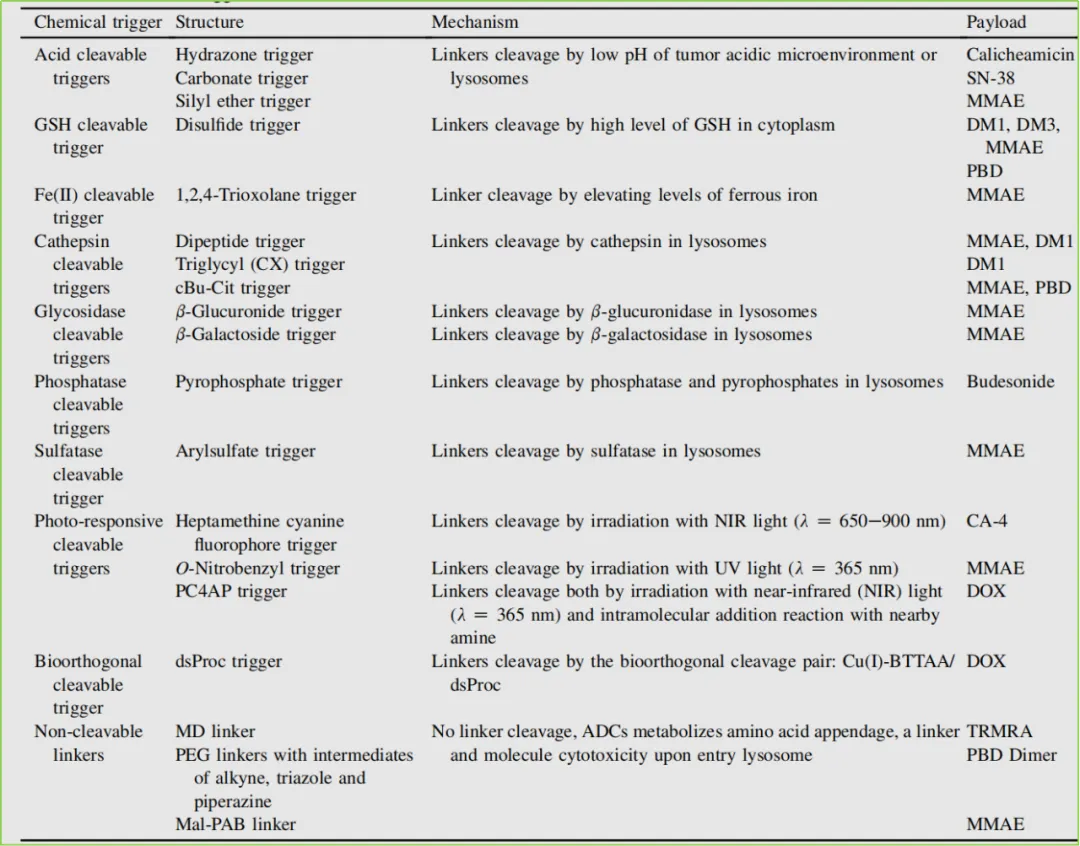图4 linker相关的一些化学触发总结 图片来源:Acta Pharmaceutica Sinica B 2021;11(12):3889e3907