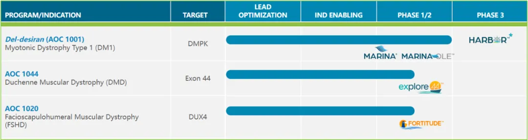 Avidity Biosciences临床在研的3个项目即针对上述的3种肌肉罕见疾病。如del-desiran(AOC1001)是Avidity Biosciences公司利用AOC平台开发的重点产品,其由3部分组成:靶向转铁蛋白受体1(TfR1)的全长单抗、连接子、靶向DMPK mRNA的siRNA,适应症为强直性肌营养不良I型(DM1)。目前,1/2期临床试验MARINA已完成,正在积极推进高阶临床,即将在成人DM1患者中进行HARBOR试验。另外两款产品AOC1044和AOC1020也在临床积极推进中。