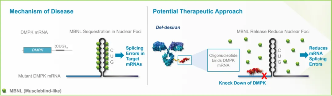 以DYNE-101为例,DYNE-101现已进入临床开发,处于全球1/2期ACHIEVE临床试验中,用于DM1患者的治疗。DYNE-101由一个反义寡核苷酸(ASO)与一个片段抗体(Fab)结合组成,该片段抗体结合在肌肉上高表达的转铁蛋白受体1(TfR1),并通过降低细胞核中突变DMPK RNA的水平,阻止或逆转疾病,解决DM1的遗传物质基础。DYNE-101已被EMA和FDA授予孤儿药称号,用于DM1的临床开发。