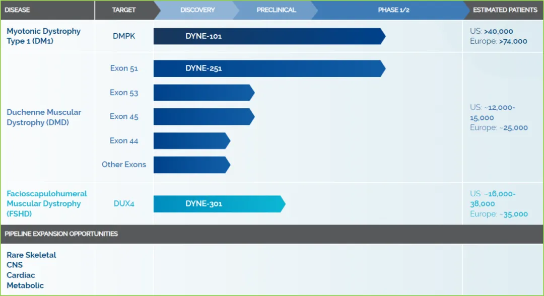 Dyne Therapeutics临床在研管线中,重点适应症同样为DM1和DMD,2款产品分别为DYNE-101(DMPK)和DYNE-251(Exon-51),当前均处于临床1/2期阶段。