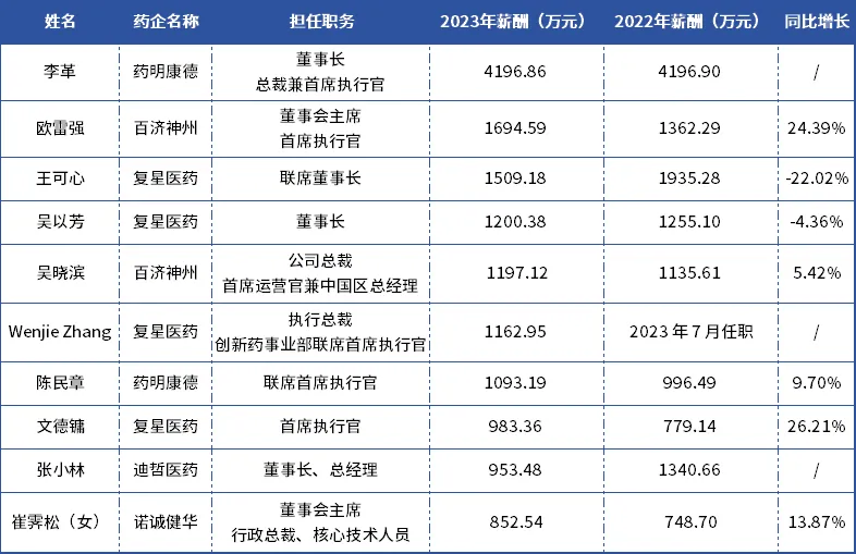 A股上市药企高管2023年薪酬TOP10