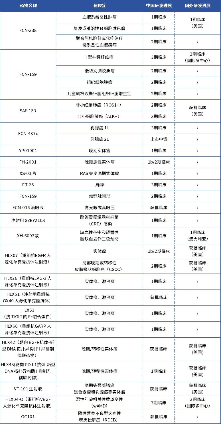 而就在研创新药而言,据复星医药2023年报显示,其自研未获批的创新药产品有多达30款,进展最快的为FCN-159、SAF-189、FCN-437c、ET-26和HLX04-O,最高已推进至3期临床或上市申请阶段。