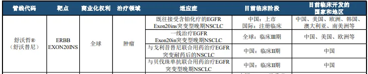 值得一提的是,舒沃替尼的临床潜力还在进一步挖掘中,据迪哲医药2023年报显示,舒沃替尼还有3项适应症正在同步临床中,其中,一线治疗EGFR Exon20in突变型晚期NSCLC的适应症全球临床试验已处于3期阶段,市场开发区域包括中国、美国和欧洲等重要市场。