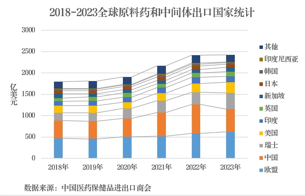 全球原料药中间体出口连续五年保持增长,2023年出口2424.2亿美元,同比增长0.4%,在2020年至2022年疫情期间,全球原料药需求尤其是大宗原料药需求显著增加,中国、欧盟、瑞士、美国、印度等原料主要供应国出口呈不同程度增长,中国原料药出口在2021年、2022年出口分别增长29.9%、21.9%,超过欧盟,跃居原料药和中间体出口额第一位,2023年,全球原料药需求面临疫情后的去库存压力,激素类、抗生素类、维生素类、解热镇痛类等大宗原料药出口竞争加剧,价格持续下降。同时,心血管类、抗肿瘤类、中枢神经类、胃肠消化道类等特色原料药市场需求持续扩大,全球特色原料药和专利原料药仍保持持续稳定增长,在此背景下,全球原料药市场格局发生显著变化,欧盟原料药出口再度超过中国,重回全球第一位。