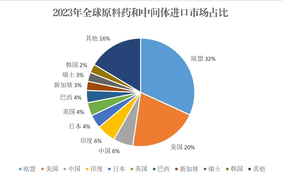 全球原料药中间体市场集中于医药制造大国,欧盟、美国、中国、印度以及日本、英国等占全球原料药进口份额的71.9%,巴西、新加坡制药工业快速发展,其原料药中间体进口量持续较快增长。