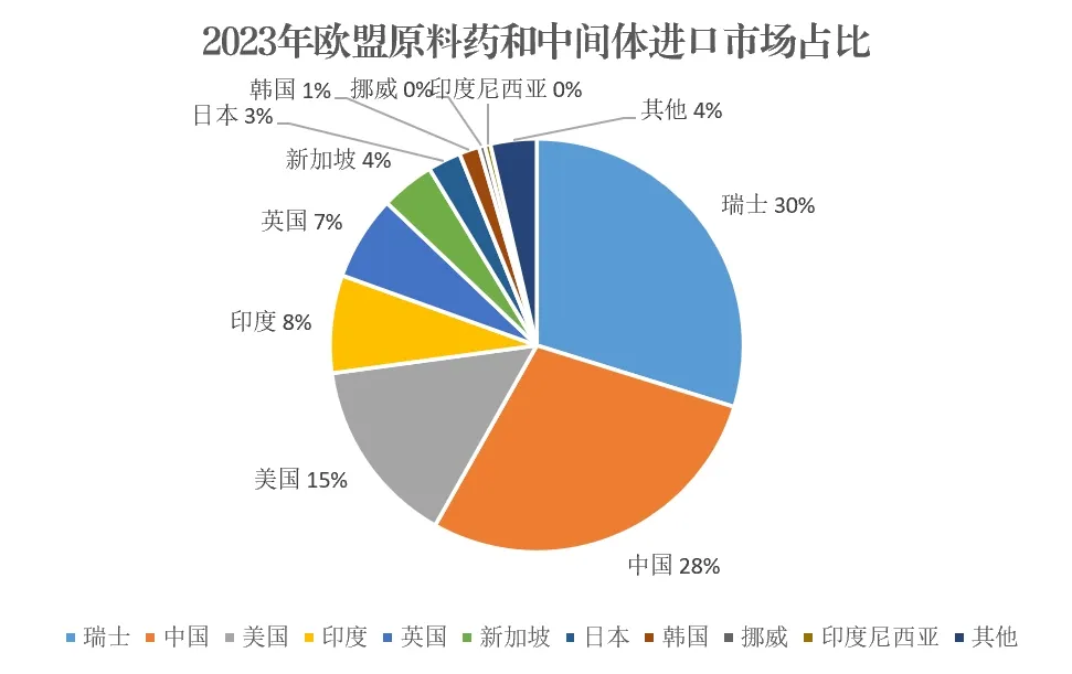 在2023年初,欧盟发布“促进原料药(API)生产的潜在措施”报告,意在促进 API 生产回归本土。在过去十年中,欧洲国家的药品短缺一直在增加,而且随着新冠疫情而加剧。根据欧盟统计,全球API产能欧盟的仿制 API 产量在全球仿制 API 总产量的 24%,亚太地区产量(中国和印度)占到 66%。在2021年,中国首次在全球市场供应了 18 种新活性物质,几乎追平欧洲(19 种新活性物质)。API 外包加剧了药物供应链的中断,因此提出了将药品生产,尤其是 API 生产回流到欧盟的提议。根据对欧盟2023年原料药进口和出口数据分析,欧盟自身原料药产能有显著增加,原料药进口减少56亿美元,出口增加34亿美元。