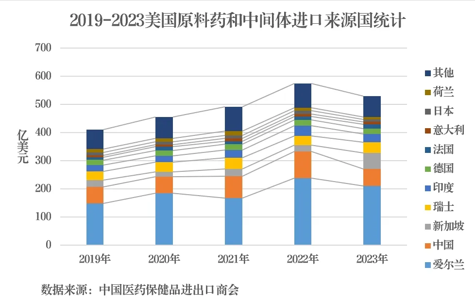 美国是全球最大原料药进口国,在2018年至2022年原料药进口复合增长率达到10%,2023年进口529亿美元,下降8%,爱尔兰、中国、新加坡是三大主要来源国,占美国进口市场份额的61.9%。