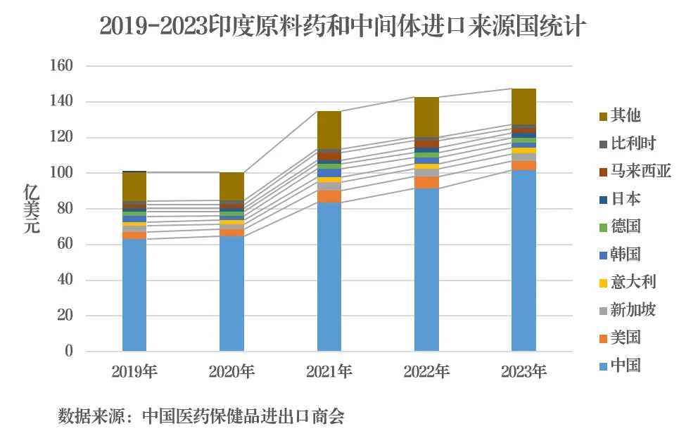 印度是第三大原料药进口国,因本国制药产业持续发展,原料药进口近五年保持持续稳定增长,复合增长率10.1%,2023年达到147.6亿美元,中国是印度原料药中间体第一大进口来源国,占进口份额的68.8%。