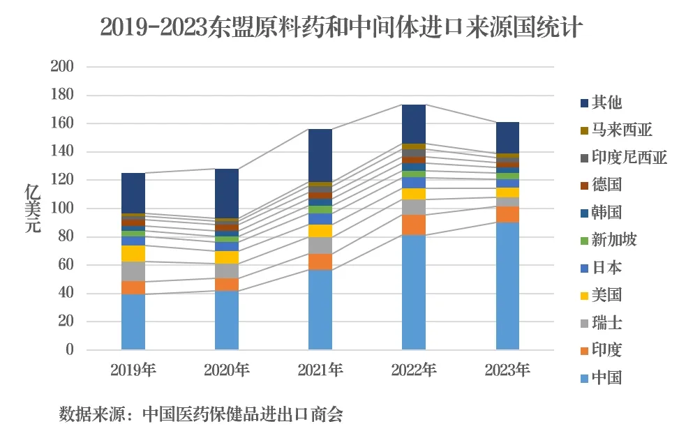 中国是东盟原料药进口的最大来源国,近5年复合增长率23.3%,2023年在原料药价格大幅下跌的形势下,对东盟出口额逆势增长11.1%,市场份额在大幅领先的同时继续扩大。