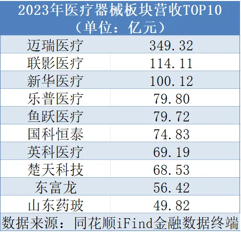 从2023年年报数据来看,A股124家医疗器械类上市公司中有迈瑞医疗(349.32亿元)、联影医疗(114.11亿元)、新华医疗(100.12亿元)三家营收突破百亿元;64家实现营收增长;107家实现盈利,盈利企业占比近九成。