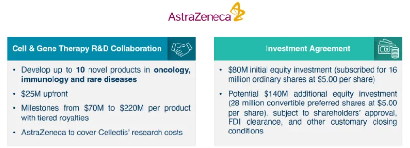 Cellectis与阿斯利康在2023年11月达成了一项初始价值1.05亿美元的协议,包括8000万美元的股权投资和2500万美元的前期付款,以开发多达10款针对癌症、免疫和罕见病的基因和细胞疗法。当时 Cellectis还提议向阿斯利康出售1.4亿美元的股权,但需要与员工代表交谈并获得股东和法国政府的支持才能最终敲定协议。现在 Cellectis 已获得法国经济部的许可,阿斯利康随即完成1.4 亿美元的投资。