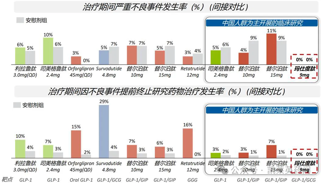 安全性和耐受性良好:整体安全性特征与玛仕度肽既往临床研究一致,未发现新的安全性信号。包括:(1)治疗期间,胃肠道不良反应是最常见的不良事件,性质为轻中度一过性,主要发生在前12周滴定期。(2)未发生重度低血糖,中度及以上低血糖发生率与度拉糖肽相当,且低血糖发生率横向对比在同类GLP-1药物注册研究中为低。(3)未见心血管风险增加的安全性信号,且与度拉糖肽特征相同。