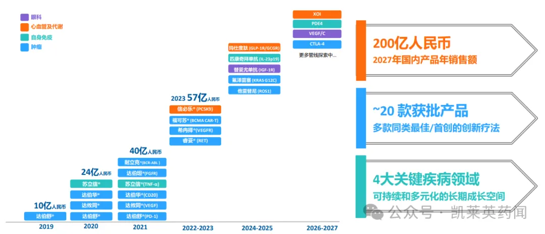 通过自主研发大力投入,对外合作共同开发,公司建立了丰富管线,计划于2027年实现约20款产品商业化,预计将达成约200亿产品销售额。