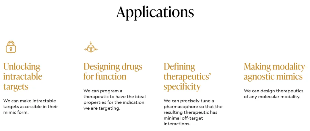 MIMIC平台旨在提供一种独特的治疗设计解决方案,专注于药效团,这是药物及其靶标相互作用的一组基本特征。该平台旨在系统地分离具有单一氨基酸分辨率的药效团,设计分子模拟物,然后优化具有微调治疗特性的分子,包括功能、特异性、选择性和多靶向性。