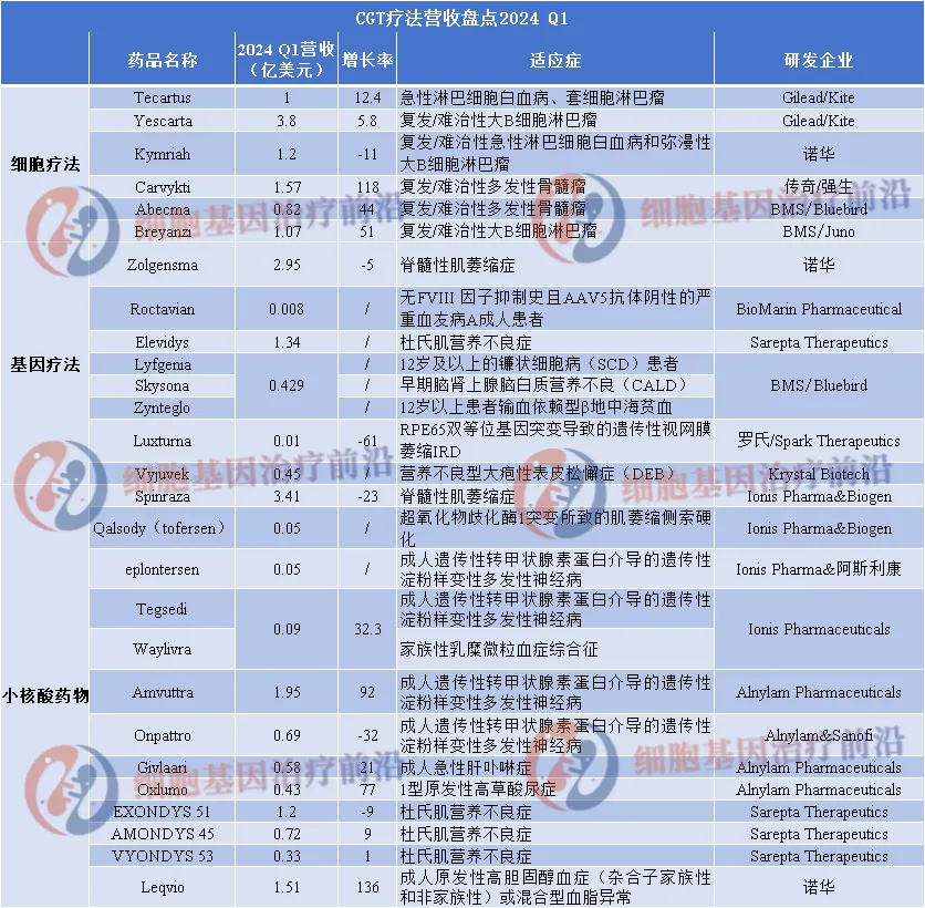 受益于CGT新药的持续上市与不断增加的治疗需求,全球CGT市场规模具有良好的发展前景。CAR-T疗法Kymriah、Yescarta和基因疗法Zolgensma等自上市以来,销售额增长可观,随着2024年第一季度各大公司财报出炉,小编总结了部分CGT疗法的营收情况以供参考。
