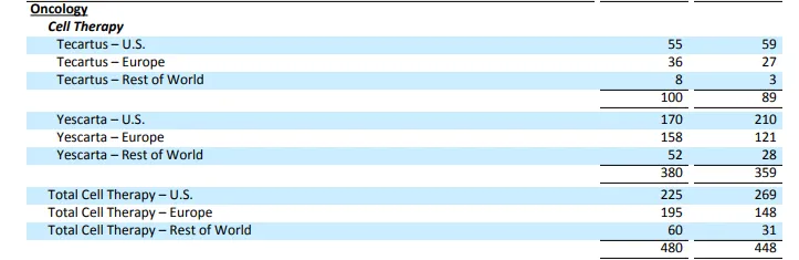 Tecartus是一款靶向CD19的自体CAR-T细胞疗法,是全球第三款获批上市的CAR-T疗法,是第一个被批准用于治疗成人复发/难治性B细胞前体急性淋巴细胞白血病(ALL)患者的CAR-T细胞疗法,也是全球首个套细胞淋巴瘤(MCL)CAR-T细胞疗法。2024 Q1 Tecartus营收1亿美元,同比增长12.4%。