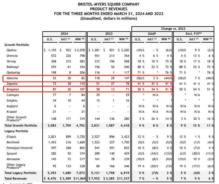 Breyanzi不仅是BMS首款获批上市的CAR-T疗法,还是全球第四款获批上市的CAR-T疗法,用于治疗复发/难治性大B细胞淋巴瘤(LBCL)。Breyanzi的获批是百时美施贵宝在细胞免疫治疗领域的一个里程碑,该药物是BMS在2019年以740亿美元收购Celgene时获得的。2024 Q1 Breyanzi营收1.07亿美元,同比增长51%。
