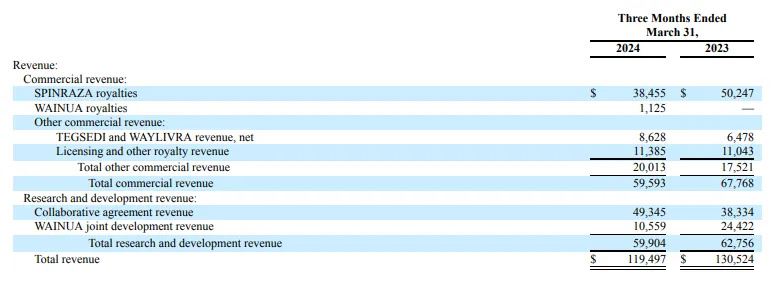lonis 2024 Q1财报中公布:Spinraza全球销售额3.41亿美元,同比下降23%。