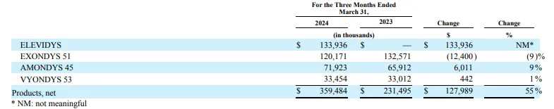 EXONDYS 51(eteplirsen)是Sarepta最早获FDA批准的用于治疗DMD的产品,也是FDA批准上市的第一款DMD治疗产品。2024 Q1,eteplirsen销售额1.2亿美元,同比下降9%;VYONDYS 53(golodirsen)2024 Q1销售额0.33亿美元,同比增长1%;Amondys 45(casimersen)销售额0.72亿美元,同比增长9%。
