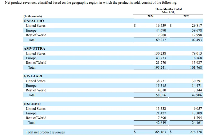 Onpattro(patisiran)是首款获得FDA批准的RNAi疗法(2018年8月获批),用于治疗由遗传性转甲状腺素蛋白淀粉样变性引起的周围神经疾病(多发性神经病)成人患者。Onpattro在2024 Q1营收0.69亿美元,同比下降32%。