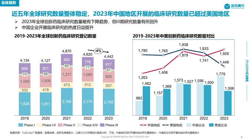 从另一个宏观统计角度来看,中国地区启动的创新药临床研究数量在2023年也首次超过美国。