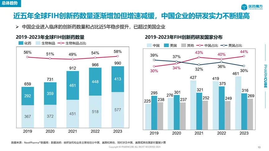 这背后的原因也值得品味。一方面是因为中国企业自己推进至临床阶段的创新药数量实现了飞跃。统计数据显示,近5年中国企业的首次人体临床研究(first in human,FIH)创新药数量和占比均稳步提升,尤其是2023年的数量和占比大幅提升,显著超过美国企业。国家药监局发布的《2023年药品审评报告》也佐证了这一点,2023年IND申请数量相比2022年增长了33.56%,达到历史新高。