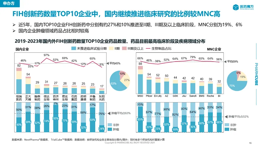 与此同时,中国FIH创新药往中后期阶段推进的成功率也在提高。相比于美国企业,中国药企在近5年继续推进创新药临床研究进入II期或III期以上阶段的比例更高,说明顺利从早期开发进入中后期开发的创新药或其适应症数量更多。