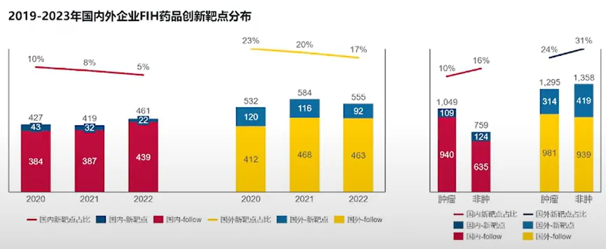 虽然数量上显示了进步,但是中国创新药这种临床开发上的高推进效率实际上是与中国药企绝大多数还是在做follow项目相关。目前,瞄准first in class新靶点开发的国产创新药占比还在较低个位数的水平,要追赶海外药企的步伐有一定差距。
