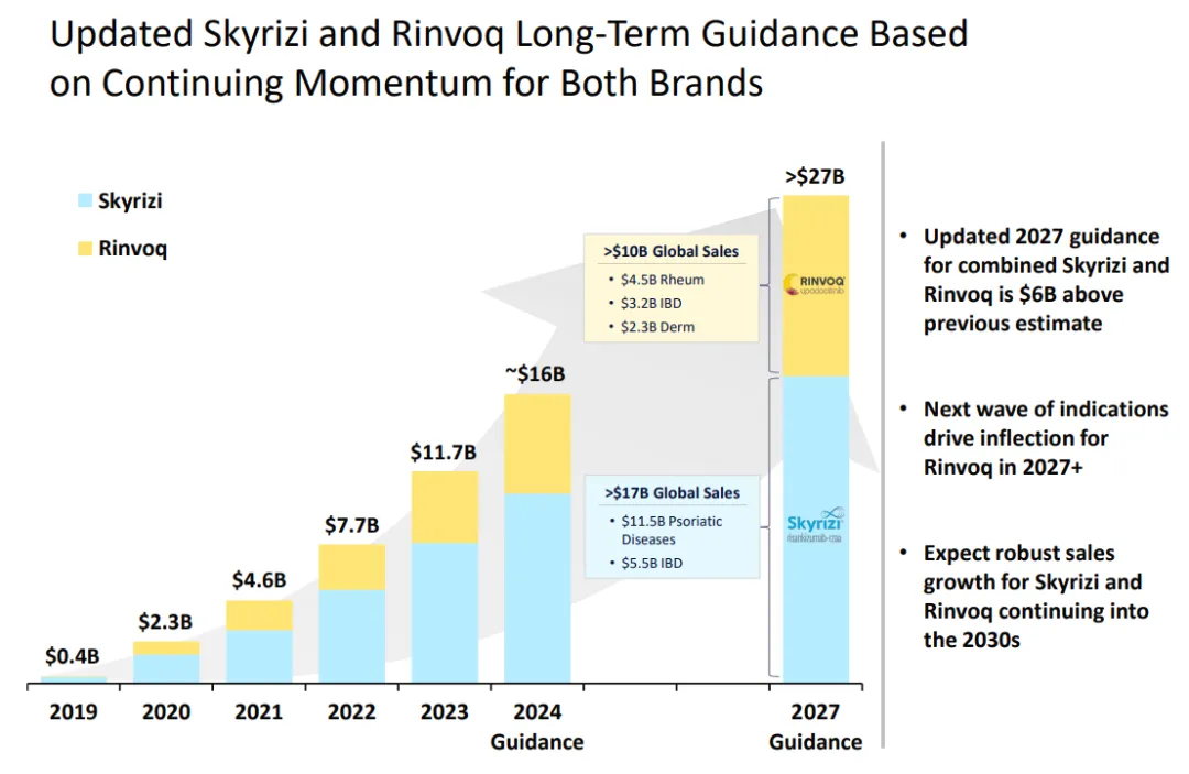 基于两款产品的增长势头,艾伯维也将Rinvoq+Skyrizi在2027年的销售预期上调至270亿美元,显著高于修美乐高峰时的212.3亿美元。