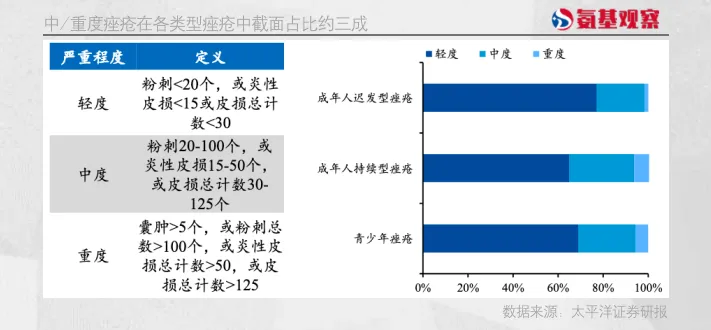 按照粉刺数量等指标评估,痤疮可以分为轻度、中度、重度。总体而言,中/重度痤疮在各类型痤疮中截面占比约三成。这些,才是用药的核心群体。