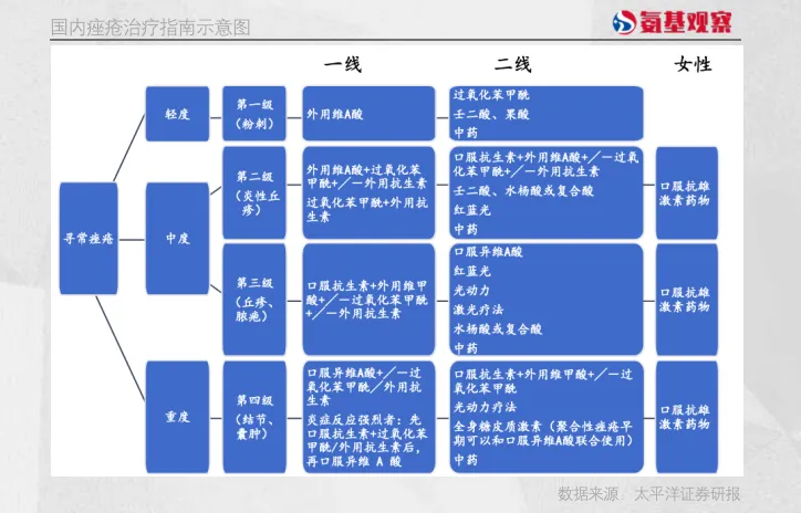 就治疗选择来看,国内可供痤疮患者治疗的药物并不少。根据轻度、中度、重度划分,不同群体都有明确的用药推荐。