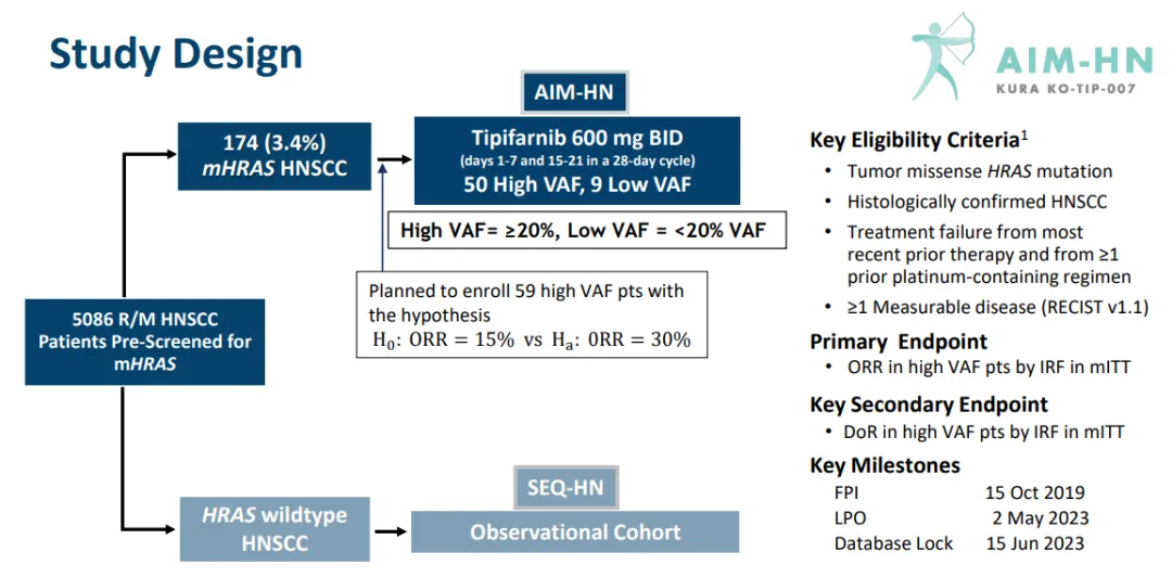 Kura的第二个候选产品Tipifarnib是一种强效、选择性和口服生物可利用的法尼基转移酶抑制剂(FTI),此前已在5000多名癌症患者中进行了研究,并在某些患者中表现出引人注目和持久的抗癌活性,且副作用可控。2021年2月,替匹法尼被FDA授予突破性治疗指定,用于治疗复发性或转移性HRAS突变头颈部鳞状细胞癌(HNSCC)患者,这些患者在接受以铂为基础的化疗或高VAF后出现疾病进展,且变异等位基因频率≥20%。