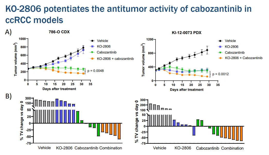 其临床前数据显示,用KO-2806和Adagrasib联合治疗KrasG12C突变型NSCLC的临床前模型,可加深多个节点的信号抑制,包括丝裂原活化蛋白激酶和mTOR通路,同时降低细胞增殖。在源自NSCLC肿瘤的细胞衍生的异种移植物或CDX和PDX模型中,KO-2806与Adagrasib的组合诱导了肿瘤消退。此外,CDX和PDX模型显示,与单药治疗的Adagrasib相比,抗肿瘤反应的持续时间和深度增强。