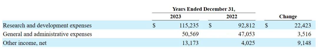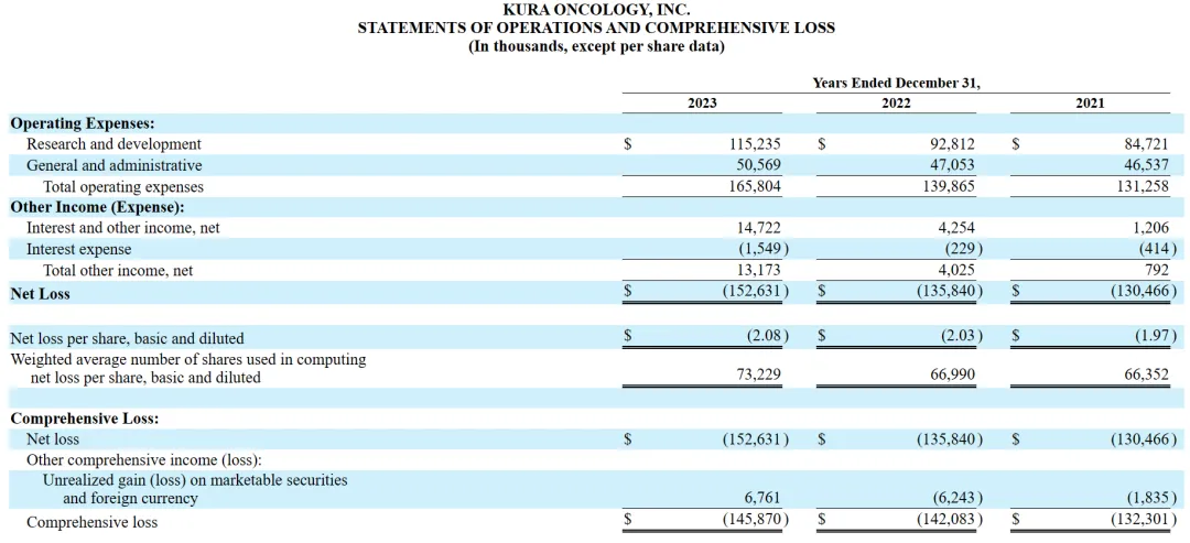 一般及行政开支:与2022年相比,截至2023年12月31日止年度的一般及行政开支增加,主要是由于专业费用及人员成本增加所致。Kura预计其一般及行政开支将于未来期间增加,以支持计划增加的研发活动。