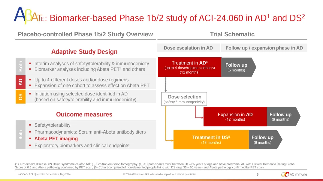经过多次数据安全监测委员会(DSMB)审评,迄今为止在ABATE试验中未发现任何安全问题,与之前的结果一致。ACI-24.060同时展现积极的免疫原性数据,去年公布的数据显示,低剂量ACI-24.060最快在接种后第六周(接种第二剂疫苗后两周)就激发抗Aβ抗体反应。AC Immune预计在2024年第二季度公布ABATE试验2期部分,患者在接受治疗6个月后的Aβ正电子发射断层扫描(PET)成像结果,并在同年第四季度公布患者治疗12个月后的Aβ PET成像数据,这些成像数据将显示患者脑部淀粉样斑块减少的情况。此外,AC Immune也预计在2024年下半年公布ACI-24.060在唐氏综合征患者队列的初步安全性和免疫原性数据。