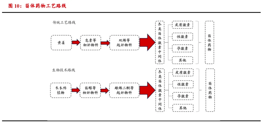 产业链方面,甾体药物具有较长的产业链,根据甾体药物不同的工艺路线和产物,分为起始物料、重要中间体、原料药及制剂。而国内上市公司较为有看点的企业则是位于中游的共同药业,赛托生物以及位于下游的仙琚制药。