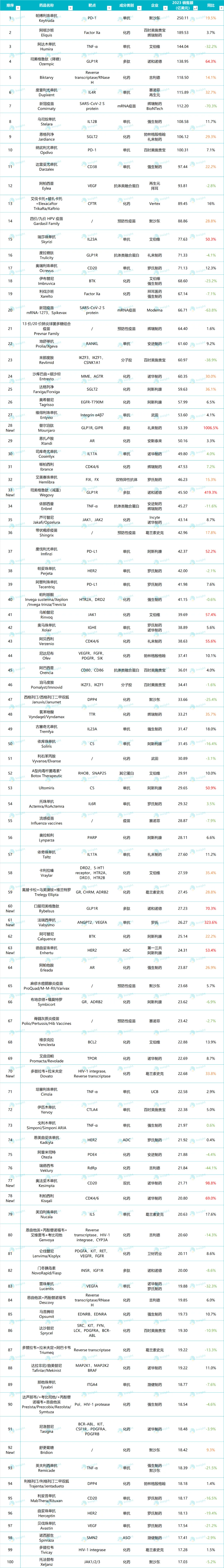 2023 年度 TOP100 药品销售榜单* 根据已公布药企财报人工整理,如有错漏还请评论区指正