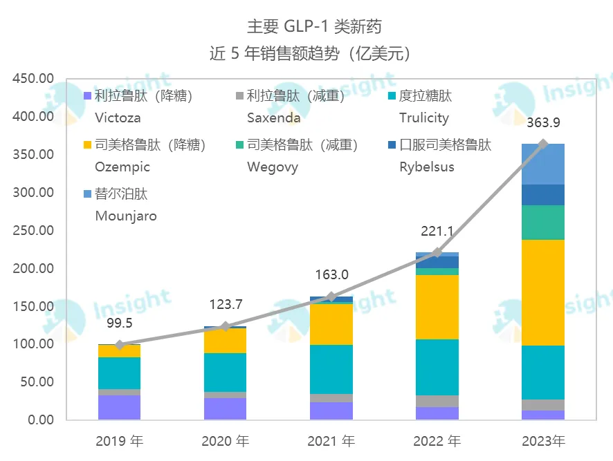 这一年,有 14 款 TOP100 药品的同比增长率超过了 40%,除了微有回落的度拉糖肽之外,登榜的 GLP-1 们均在此列。