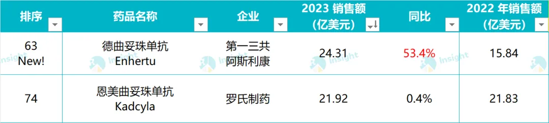另外,除本次入榜这两款之外,吉利德的戈沙妥珠单抗和罗氏的维泊妥珠单抗今年也涨势迅猛。它们分别于 2020 年和 2019 年首次获批,迄今不过 5 年,今年戈沙妥珠单抗同比增长 56.32% 跨过 10 亿美元门槛,而维泊妥珠单抗则增长 103.49% 实现 9.33 亿美元销售额。