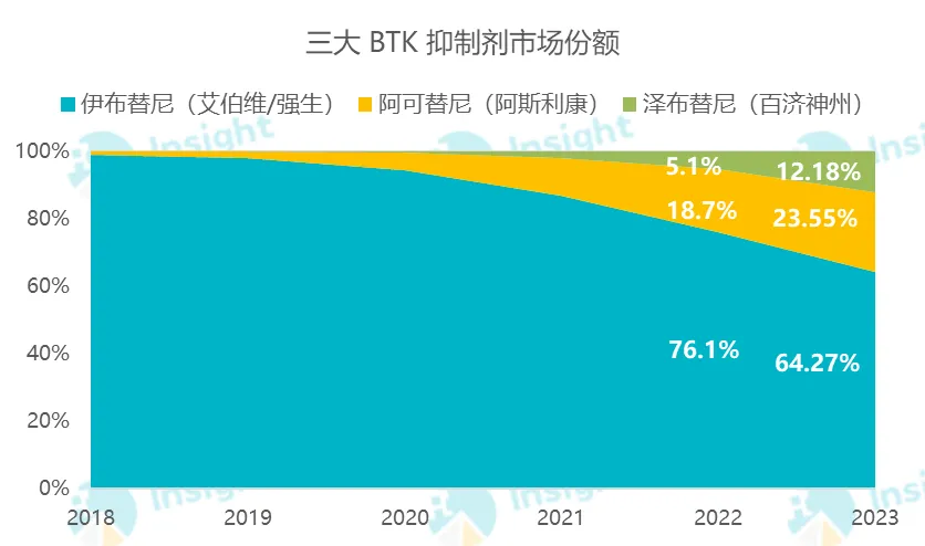 通常,同靶点的前三家有望攫取最大的市场份额,而泽布替尼恰是 BTK 靶点的前三家。BTK 抑制剂市场规模在 2021 年度就已经达到了 113 亿美元。虽有阿斯利康、百济神州、礼来等后来者围追堵截,试图分一杯羹,但仅强生/艾伯维联手推出的 First-in-Class 药物伊布替尼当时独霸 86.6%。不过这一情况在 2022 年逐渐出现转变,伊布替尼开始负增长,而阿斯利康的阿可替尼和百济神州的泽布替尼开始狂追。