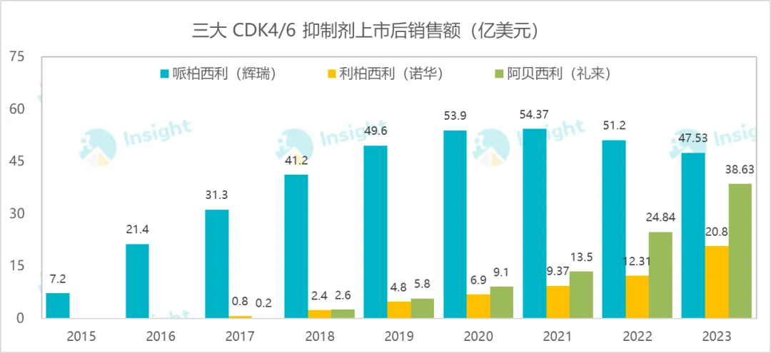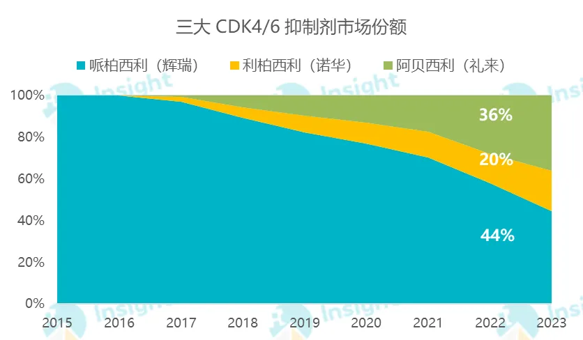同为肿瘤领域化药,CDK4/6 抑制剂的走势与 BTK 有相似之处,或许值得参考。2021 年度,该靶点总销售额 77 亿美元,辉瑞的哌柏西利占比超过 70%,到 23 年,其占比已经缩窄到了 44%。取而代之的是同靶点的阿贝西利(礼来)、利柏西利(诺华)。