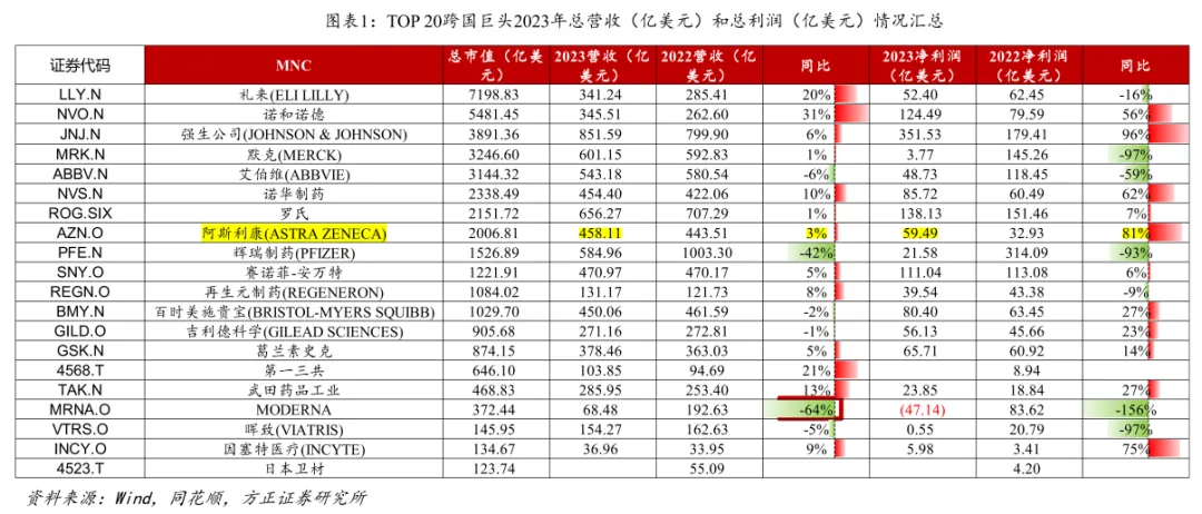 TOP 20跨国巨头2023年总营收(亿美元)和总利润(亿美元)情况汇总;图片来源:方正证券研报