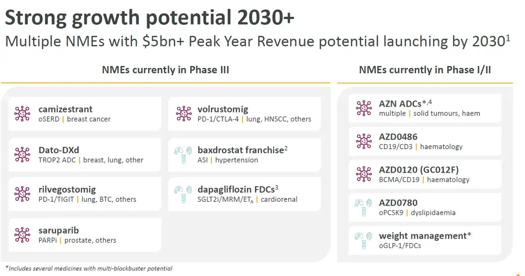 在近期举办的2024年投资者日活动中,阿斯利康公布了多项重要信息:预计在2030年前将有20款新药获批上市,其中不乏销售峰值有望超过50亿美元的潜力药物,并计划在2025年底前公布超过40项Ⅲ期临床数据。若后续新药能成功拓展更多适应症,其市场价值将超过800亿美元。